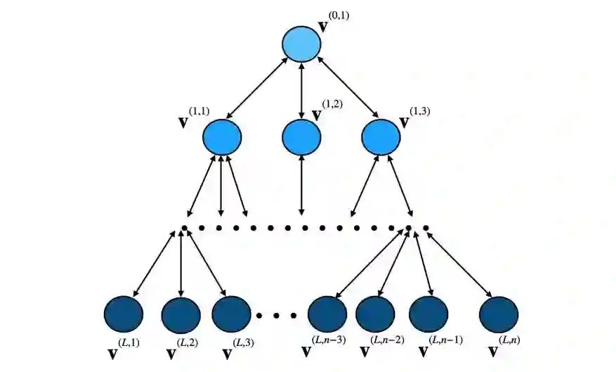 例如树结构的参数服务器,其叶节点为工作站,非叶节点为参数服务器: