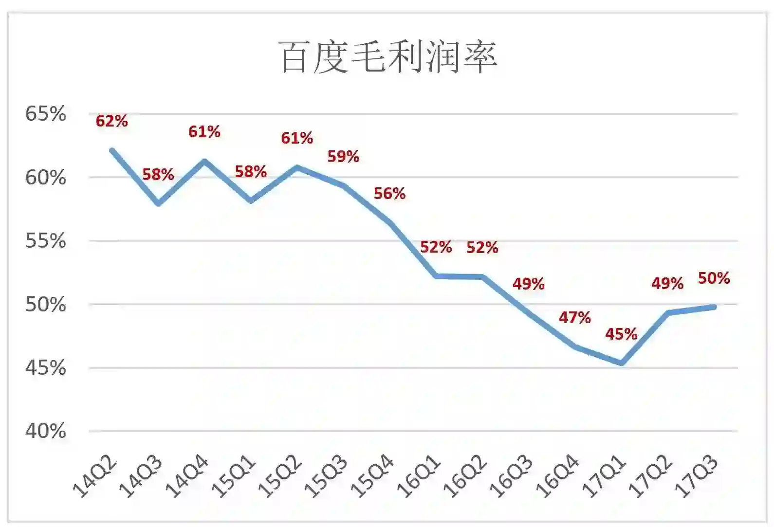 2014年以来,百度毛利润率呈现过山车走势。从2014年Q1的62%跌到2017年Q1的45%,对巨型公司而言,毛利润率跌十几个百分点是灾难性的。