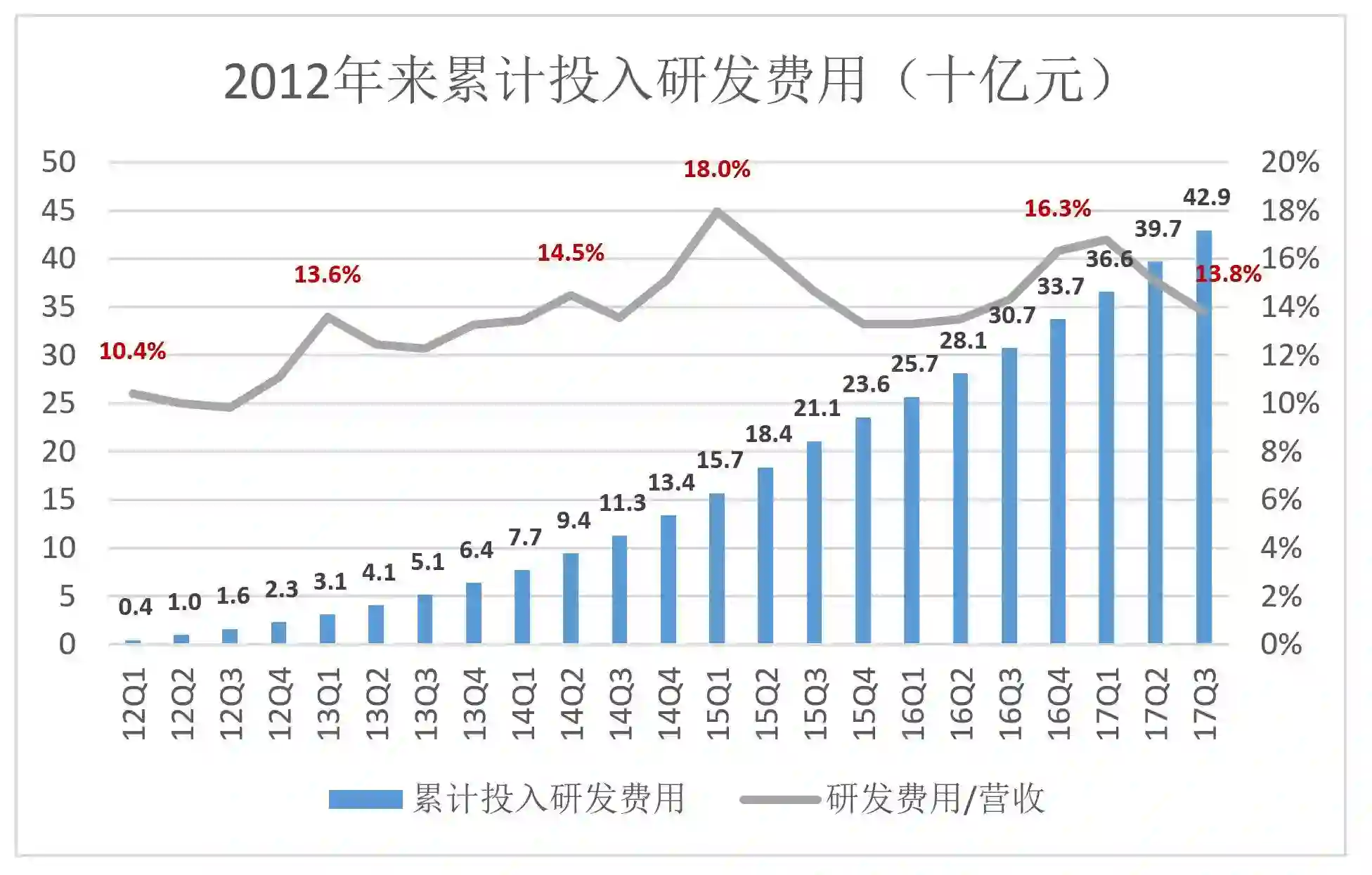 2012年以来,百度研发投入一直高于营收的10%。2017年Q3投入32.4亿,占营收的13.8%。过往12个月合共投入122亿、占同期营收的15.3%。
