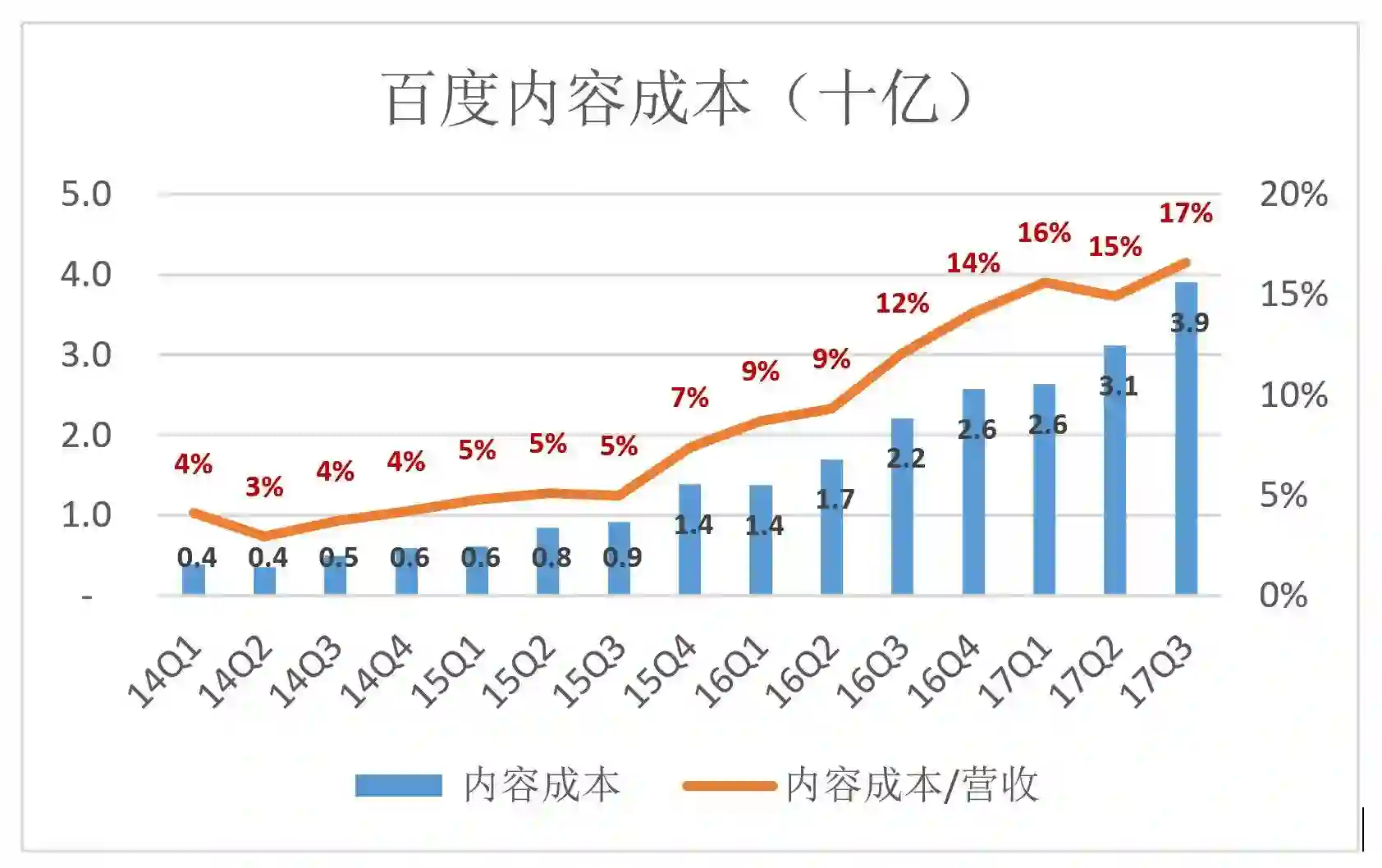 剔除爱奇艺因素,百度内容获取成本占营收的比例在5%一线。而2017年Q3,内容成本达39亿,占总营收的17%。