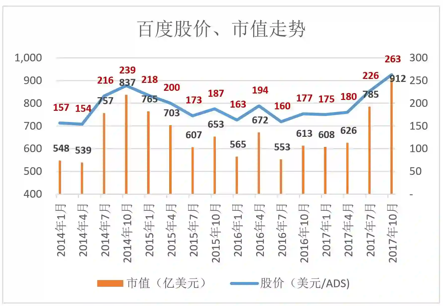 2017年7月开始,百度股价迅速回升并创出新高。按10月25日收盘价计算,百度市值为912亿美元。