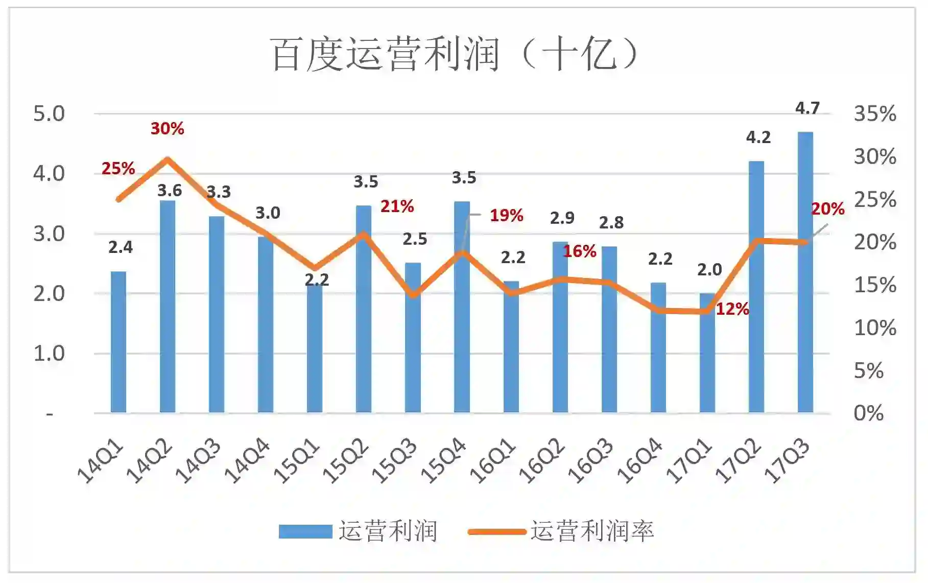 2017年Q3,百度运营利润达到创纪录的47亿,运营利润率恢复到20%一线。