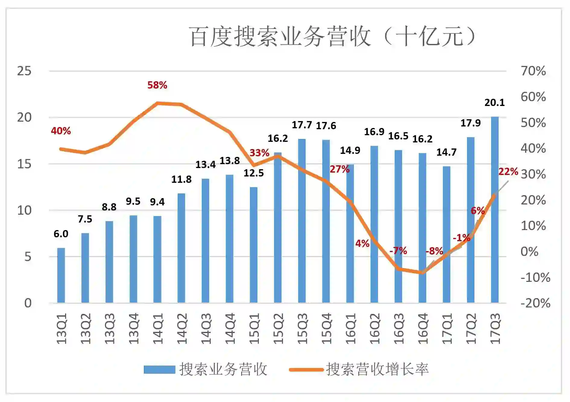 营收创新高的动力是搜索业务复苏。2016年Q3、Q4及2017年Q1,百度搜索收入连续三个季度出现负增长。2017年Q3同比增速回升到22%。