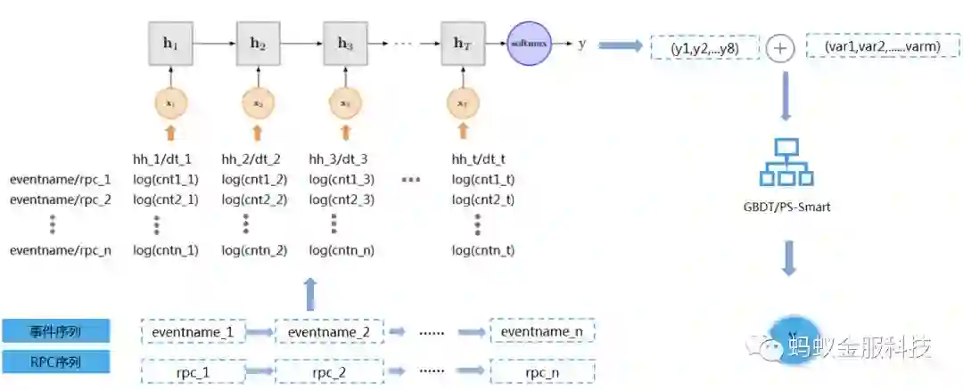 基于这些行为序列,我们可以通过特征工程来刻画变量,加入到现有模型中,也可以直接基于深度学习来自动学习刻画这些变量。因此我们引入了基于操作、支付以及浏览行为的事件序列,采用LSTM模型结构深入刻画主动方(账户)以及被动方(账户/卡Bin)的异常行为链,以提升整体的欺诈风险识别能力。