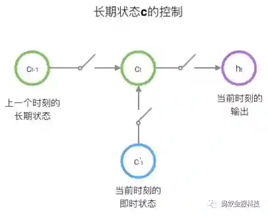 RNN的隐藏层只有一个状态h,它对于短期的输入非常敏感,LSTM中增加一个状态c (cell state)来保存长期的状态。LSTM中使用三个控制开关控制长期状态c,第一个开关负责控制继续保存长期状态c,第二个开关负责控制把即时状态输入到长期状态c,第三个开关负责控制是否把长期状态c作为当前的LSTM的输出。三个开关的作用如下图所示:
