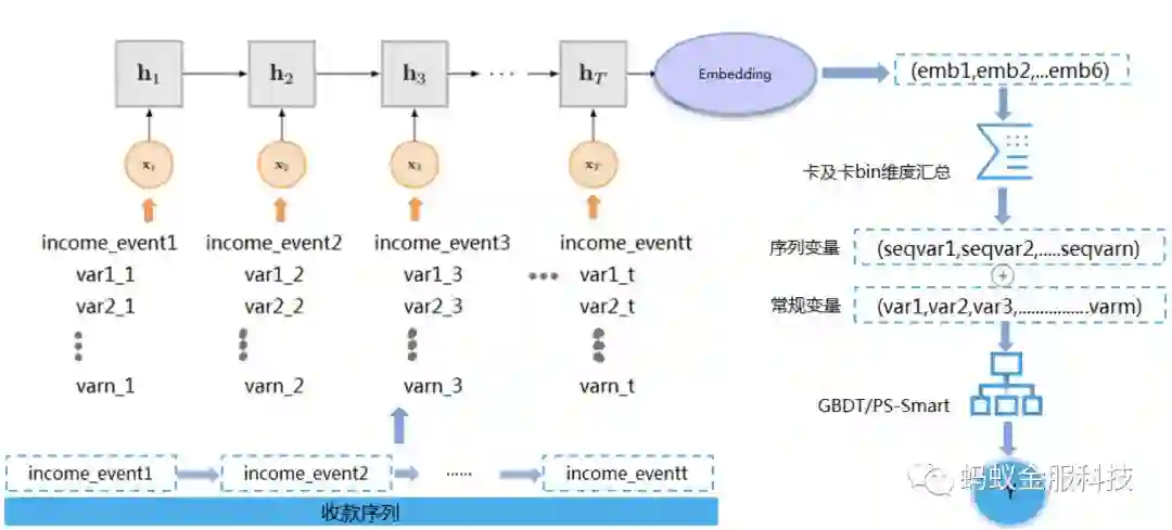 如前面已提到转账到卡场景欺诈的防控难点在于新卡的防控。根据历史经验群体变量及FTG变量对于新卡有一定的防控效果,目前在转账到卡场景已刻画城市、年龄及卡bin等维度的FTG变量。为了进一步防控新卡风险,我们从群体及FTG变量的思路出发,利用深度学习序列建模生成卡维度的embedding,然后将卡维度的embedding再汇总到卡bin维度,汇总的embedding提炼了该卡bin的行为信息,从而对于新卡来说只要其卡bin出现过就可以获取其卡bin行为特征。最后将生成的embedding变量与现有变量合并建模,输出整体欺诈风险分值,具体流程图如下: