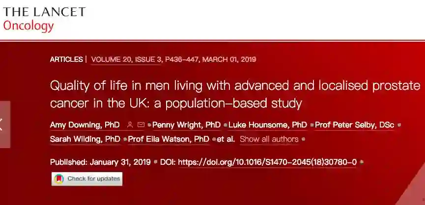 1. Downing A, Wright P, Hounsome L,et al.Quality of life in men living with advanced and localised prostate cancer in the UK:a population-based study[J].The Lancet Oncology,2019,20(3):436-447.