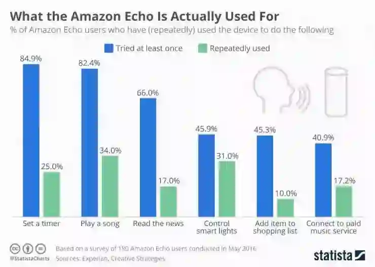 据 Experian 和 Creative Strategies 的调研显示,Echo 使用最多的功能分别是音乐播放、控制灯光、设置闹钟;用户至少尝试过一次的功能中,排在前三则是闹钟(85%)、音乐播放(82%)、新闻播报(66%)。而一直作为宣传重点的“叫车”服务,体验比例仅为 6%。