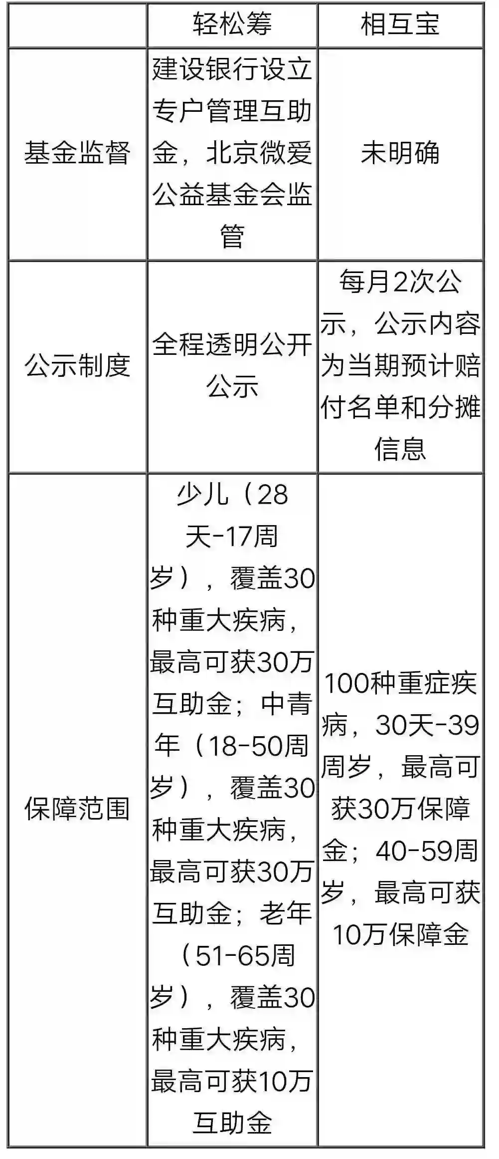 与此前的网络互助产品相比,“相互宝”有哪些异同?第一财经记者将其与网络互助轻松筹进行了对比。