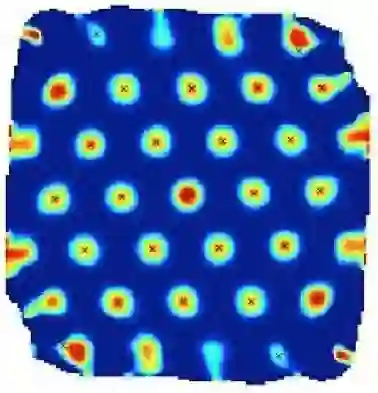 2005年,Moser夫妇发现了大脑内嗅皮层更为神奇的网格细胞。他们记录大鼠运动时特定神经细胞被相应激活的规律,发现如上的图像,其中黑线是运动轨迹,而红点则是在该位置相应细胞被激活的记录。统计去噪后,模式是这样的,呈现规律的六方排列!
