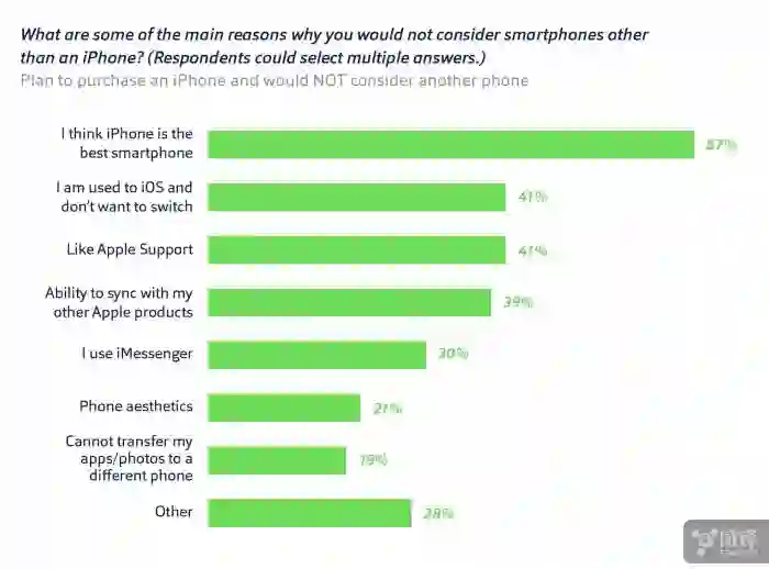 事实上,67%的用户认为iPhone是最好的智能手机。 41%的这些忠实者提供了另一个线索。他们承认自己已经习惯了iOS系统而不想更换。