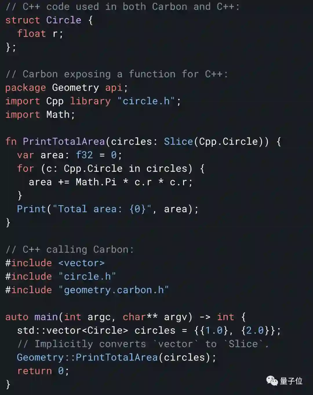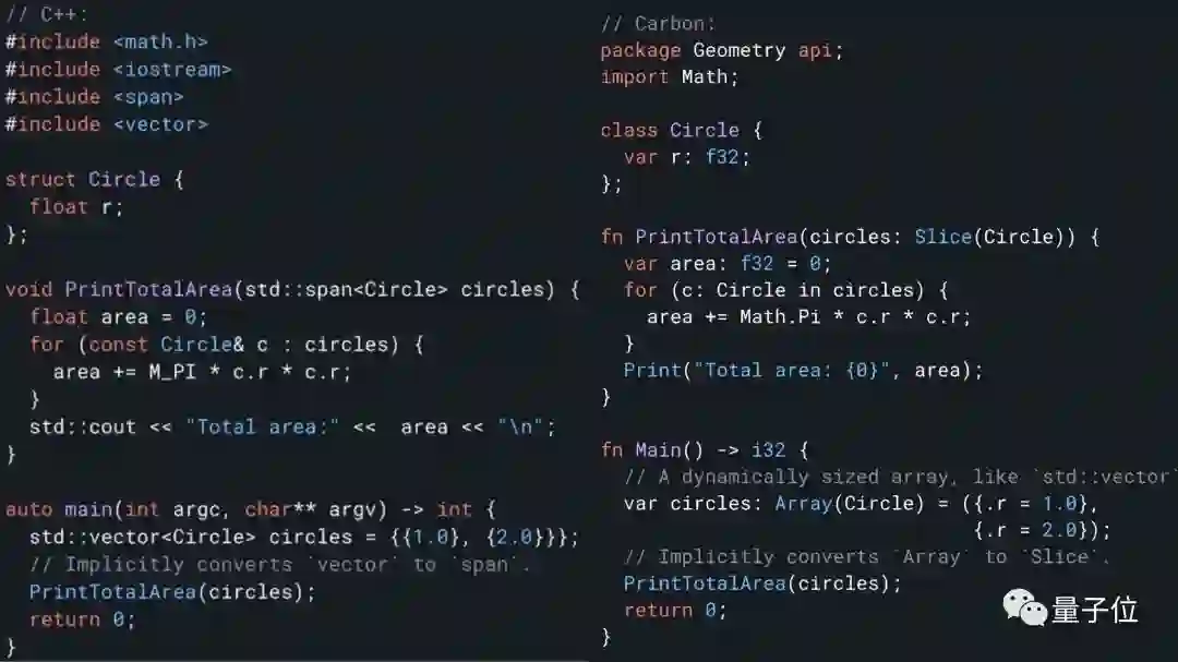 举个简单的例子:用C++代码和Carbon代码分别计算半径为1和2的两个圆面积之和。二者对比如图: