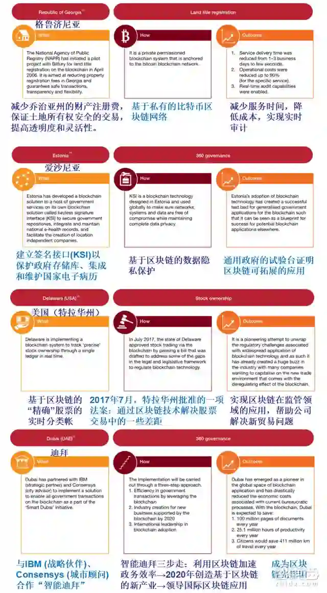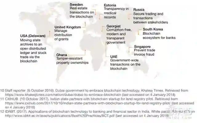 目前,爱沙尼亚、格鲁吉亚、阿联酋、瑞典、美国和英国等国家已率先在政府和公共部门开展区块链应用。