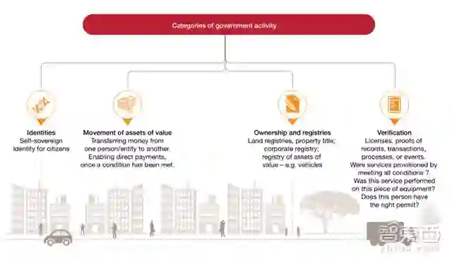 ▲区块链的智慧城市中的政府应用(公民身份、资产流动、所有权/等级、认证/身份识别)