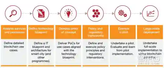 ▲区块链用例发展的六大阶段(分析服务和流程→定义技术蓝图→发展概念→政策和监管框架→发展试点→规模化)