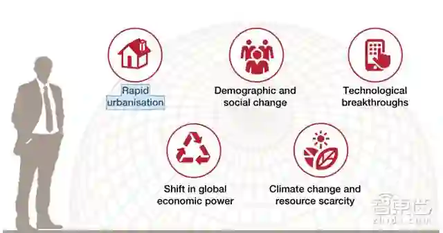 ▲五大全球发展趋势(快速的城市化、人口和社会变化、技术突破、全球经济力量转移、气候变化和资源匮乏)