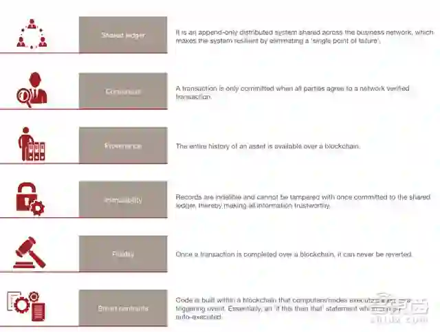 ▲区块链的六大特征(共享分类帐、共识机制、可溯源、不可篡改、交易完成不可恢复、智慧合约)