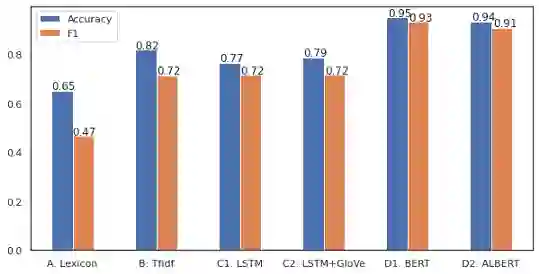 模型A表现不佳,因为输入过于简化为情感得分,情感分数是判断情绪的单一值,而随机森林模型最终将大多数数据标记为中性。简单的线性模型只需对情感评分应用阈值就可以获得更好的效果,但在准确度和f1评分方面仍然很低。