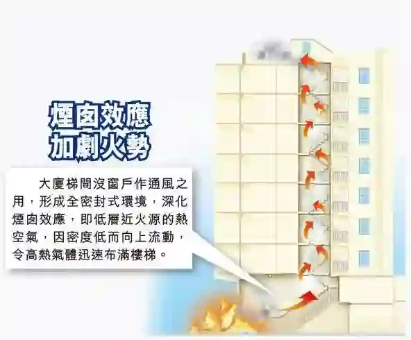 高楼火灾具有破坏力极大、扑救难度极大、火灾蔓延途径多等特点。高层火灾破坏力一定程度上源于高层建筑的“烟囱效应”——高层建筑内部有大量的管道、竖井、楼梯间、电梯井、排气道等各种横、竖向管井、通道,从地面一直通到最高层。一旦发生火灾,这些部位就成了一座拔风的“烟囱”,加速火势的蔓延,且蔓延途径多、速度快。而且是建筑物越高,“烟囱效应”越明显。