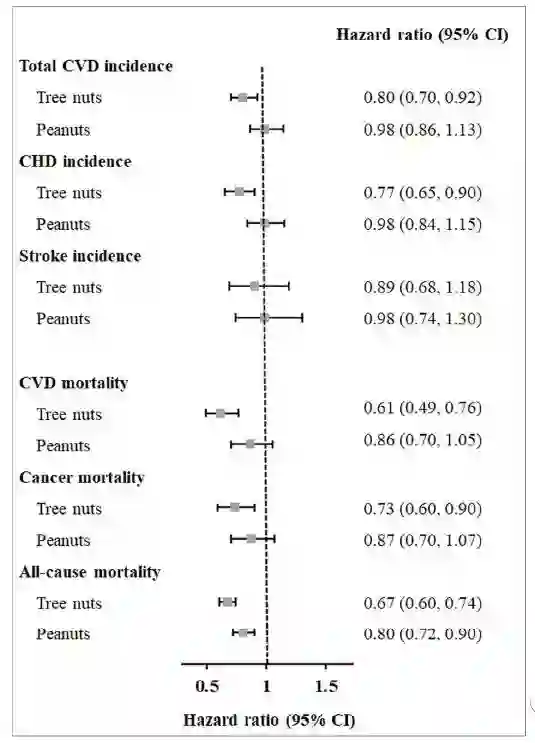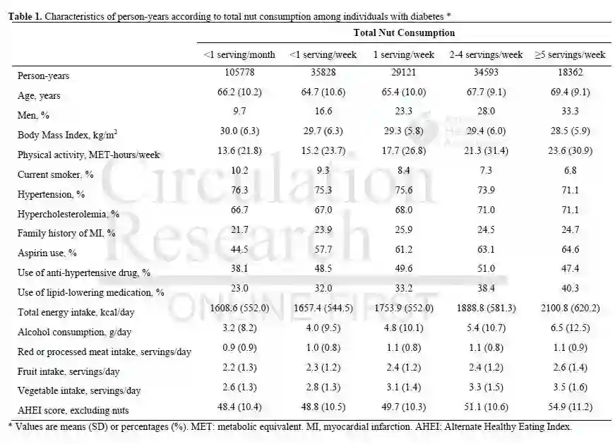 在这项新研究中,研究人员分析了16217名男性和女性在被诊断为2型糖尿病之前和之后自我报告的饮食调查问卷,并询问他们在几年时间内对花生和树坚果的食用情况。在随访期间,总共发生了心血管疾病3336例(其中冠心病2567例,中风769例),死亡5682例(其中心血管疾病1663例,癌症1297例)。
