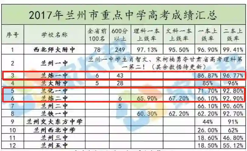 下图红线框出的这三所中学二本上线率可以达到90%,一本上线率也可以达到70-85%,而兰州市的一本上线率常年仅维持在20%上下;二本上线率常年仅维持在30%上下。