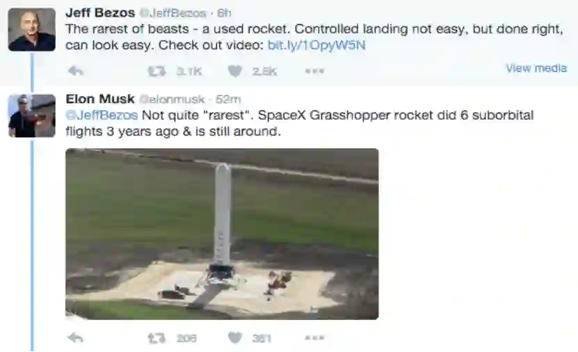 在2015年蓝色起源完成可重复火箭回收时,贝佐斯称赞为“稀奇了,火箭回收”,马斯克则忍不住回应,这有啥稀奇,我们家火箭三年前就可以了。同年12月,SpaceX成功回收首个轨道级火箭助推器,贝佐斯“点赞”送祝福,不过暗讽SpaceX是后来者。马斯克怒怼贝佐斯“刻薄至极”。而后来马斯克在接受BBC采访时被问起贝佐斯,他直接无视地回应到“这人是谁?”