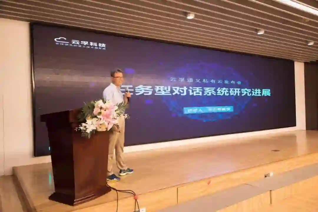 哈工大车万翔教授做了任务型对话课题分析。车万翔教授是云孚顾问科学家,斯坦福大学访问学者,荣获多2018国际CONLL多语言依存句法分析评测第一名、2016年国际中文语法错误检测评测获第1名等众多奖项。车教授介绍了人机对话系统的发展历史和重要意义,并阐述了对话系统的技术架构和DTP的技术原理。车教授还分享了小样本学习和联合学习等对话系统的最新研究进展,为对话系统的研究方向拓展了思路。车教授指出,任务型对话系统是自然语言处理的重点方向之一,对话技术评测任重道远,另外,多领域之间的移植及对话系统自动评价也有待进一步研究。车教授的研究紧扣前沿科技,凸显了云孚科技对话系统的先进技术优势,以及学术界和工业界的深度合作的巨大优势。