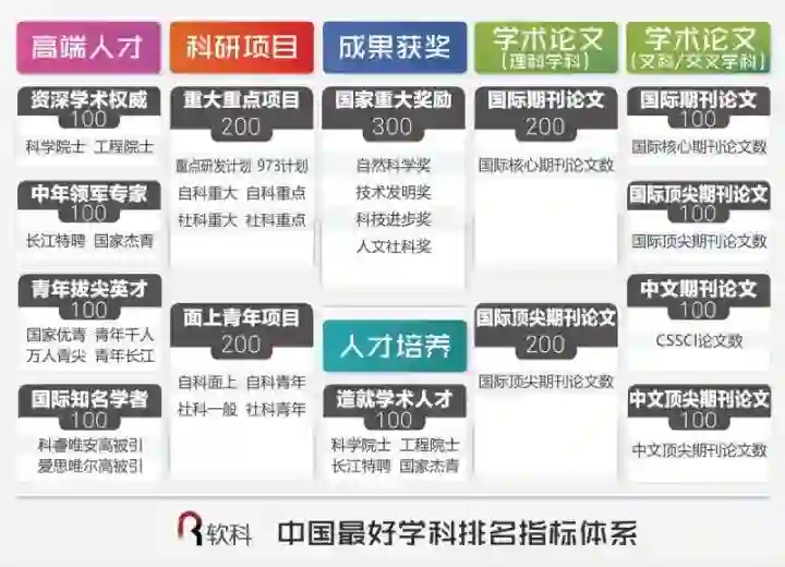 据了解,中国最好学科排名的指标体系由软科开发的学科发展水平动态监控系统内嵌的30余项测量指标所组成,这些指标全部都是高校学科建设部门日常管理中密切关注的关键指标,代表了学科点对本学科稀缺资源的占有情况。软科将这30余项指标划分为10余个指标维度分别计算得分,然后归纳为高端人才、科研项目、成果获奖、学术论文、人才培养5个指标类别,最后汇总得到学科点的总分。
