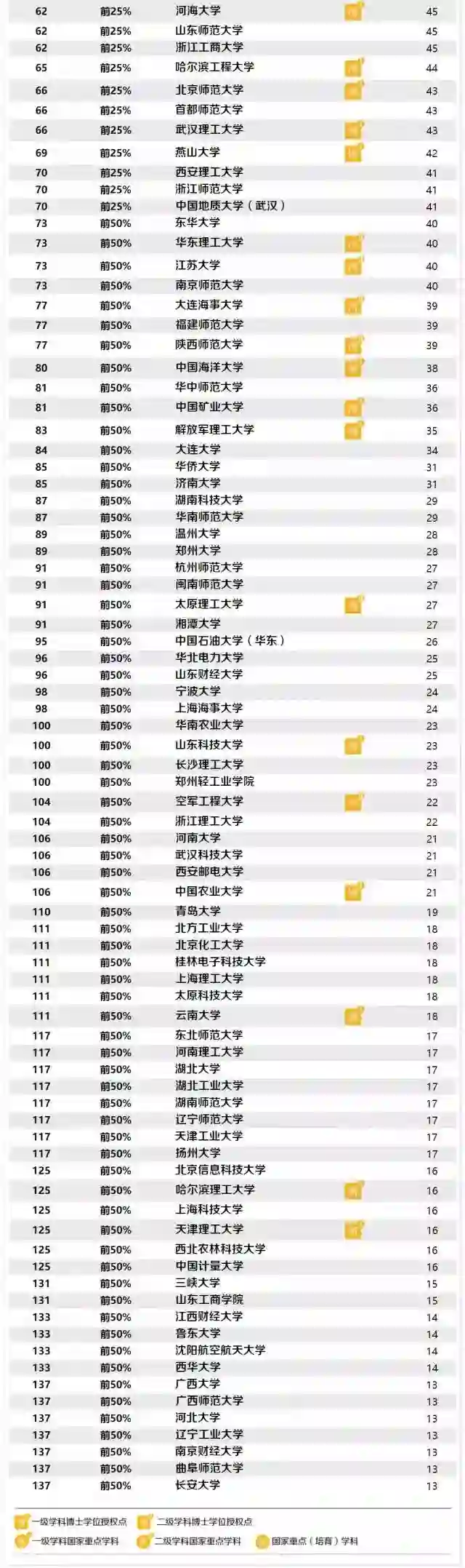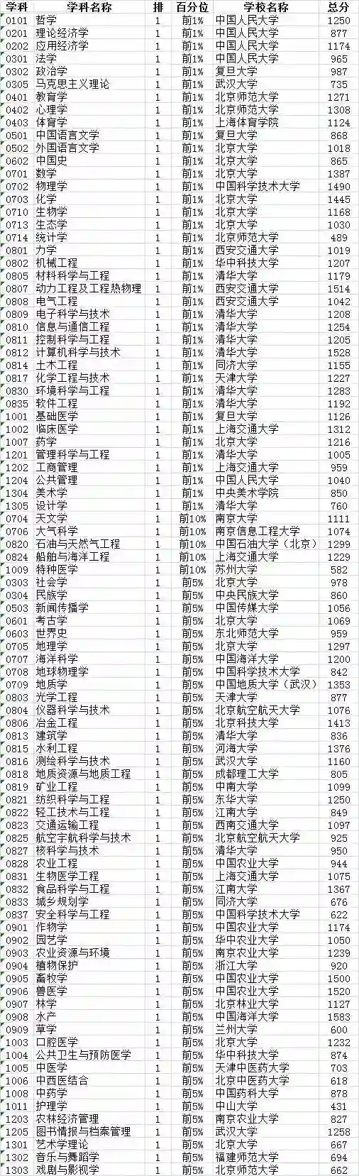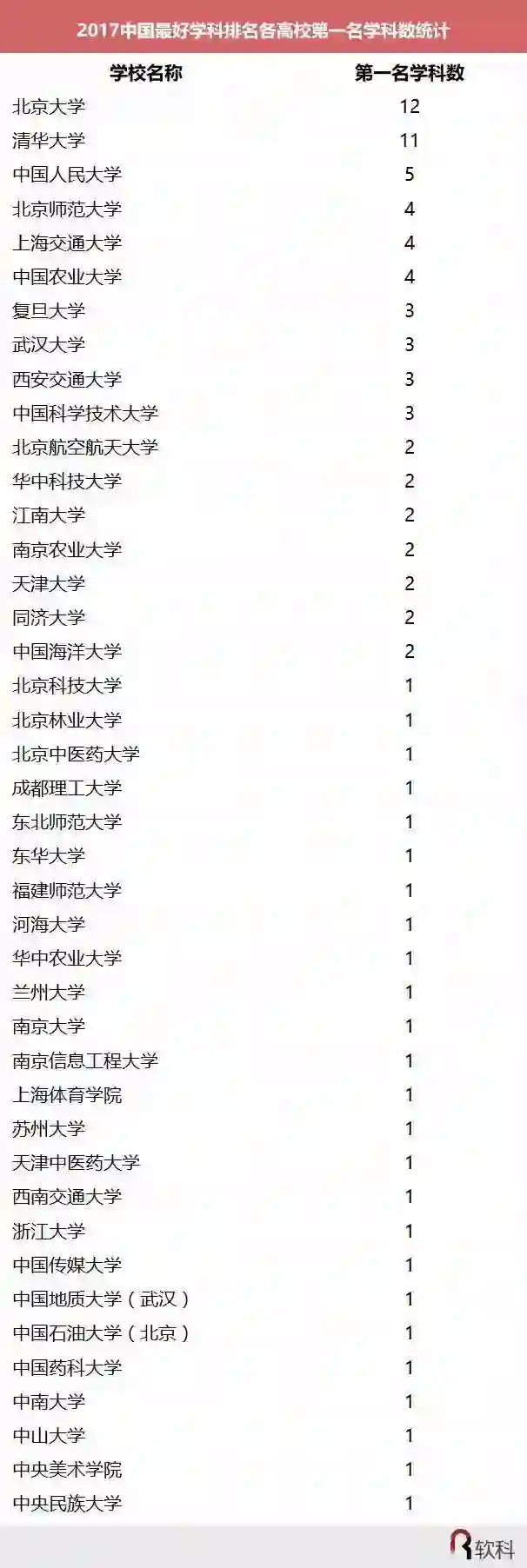 总体上,全国拥有第一名学科的高校共42所,这一数字正好与“双一流”建设高校的数量相当。