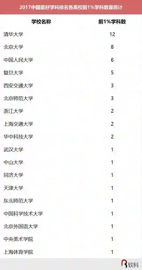 根据计算,共有18所大学的52个学科点入选全国前1%学科。清华大学以12个全国前1%学科成为各校之首。北京大学有8个前1%学科,位列第二。中国人民大学有6个,名列第三。复旦大学有5个学科点入选前1%学科,排在第四。西安交通大学和北京师范大学各有3个学科点成为全国前1%,表现出众。
