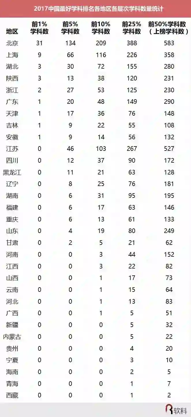 从各省级行政区的上榜学科数量来看,北京占据绝对优势,在各层次的学科数都高居全国第一。上海的前1%学科数、前5%学科数、前10%学科数均位列全国第二,拔尖学科数量领先其他地区。江苏的前25%学科数和前50%学科数仅次于北京,展现出雄厚的学科整体优势。湖北、陕西、浙江、广东等省的拔尖学科数量和上榜学科总量也都处在国内前列。