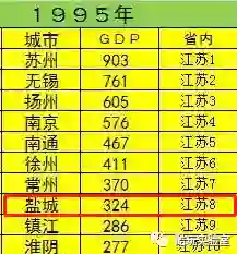1995年,盐城GDP在江苏省内排名第8,为324亿元,第一名苏州903亿元,差不多是盐城的3倍。