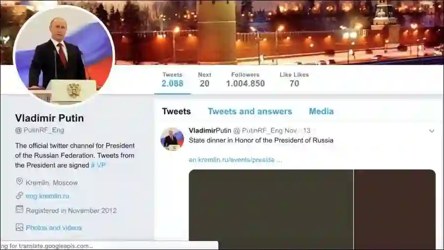 根据《商业内幕》2014年的一篇报道,普京英文账号注册于2012年注册,第一条推文是祝贺奥巴马连任美国总统。该账号拥有100万粉丝,甚至超过克里姆林宫的英文账号。因此,美媒将此账号定性为普京的官方账号。不过,由于未加蓝色认证表示,许多网友持怀疑态度。