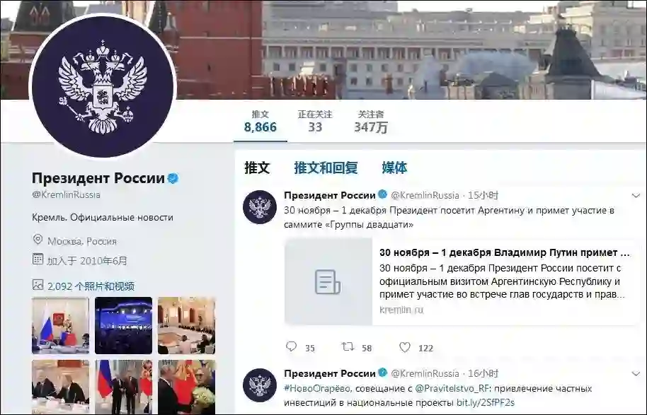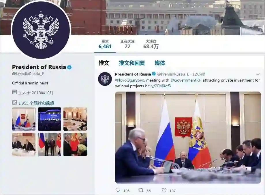 俄罗斯领导人的官方推特由@KremlinRussia_E和@KremlinRussia两个账号运营