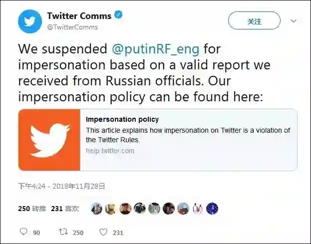对此,推特于28日发文表示:“根据我们从俄罗斯官方获得的可靠消息,我们冻结了@PutinRF_Eng这一假冒账号。”同时,推特还附上一条链接,链接中称,冒名顶替或容易误导他人的账号将被永久查封。