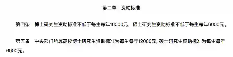 按照 2013 年财政部和教育部联合发布的《研究生国家助学金管理暂行办法》中的资助标准,「博士研究生资助标准不低于每生每年 10000 元,硕士研究生资助标准不低于每生每年 6000 元。」