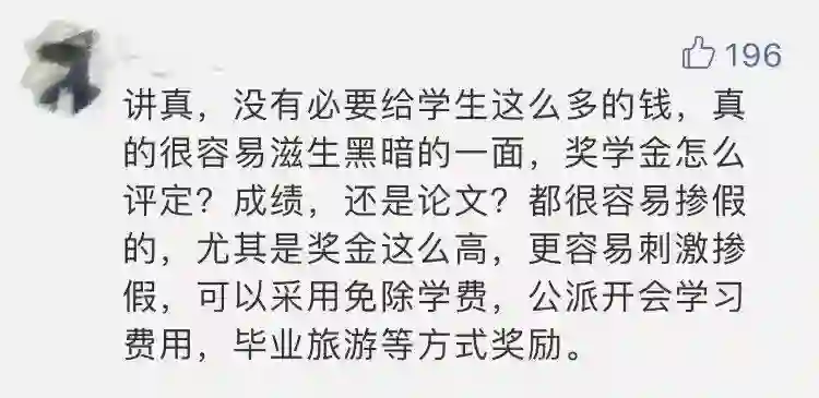 然而网上也出现了不同的声音,认为没必要给学生这么多钱,而且担心评优过程会自滋生腐败,产生不公正的乱象。