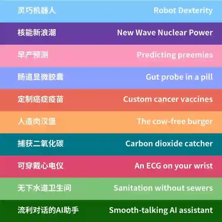今年是《麻省理工学院技术评论》杂志创刊120周年,“全球十大突破性技术”榜单也与过去稍有不同。本届评选邀请到微软公司创始人比尔·盖茨担任客座评选人,全程参与评选工作。入选的10项技术包括灵巧机器人、核能新浪潮、早产预测、肠道显微胶囊、定制癌症疫苗、人造肉汉堡、捕获二氧化碳、可穿戴心电仪、无下水道卫生间、可流利对话的人工智能助手。