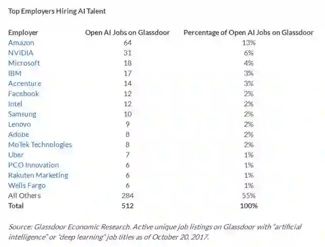 以上这些见解都来自 Glassdoor Research 的一项研究“Who's Hiring AI Talent in America?”(https://www.glassdoor.com/research/studies/ai-jobs/),作者是 Glassdoor 首席经济学家 Andrew Chamberlain 博士。作为一家为职场人士提供企业点评和职位搜索的社区网站,Glassdoor 发布了 2018 年最佳雇主排行榜,为接下来想在人工智能领域找工作的人才提供了参考价值。