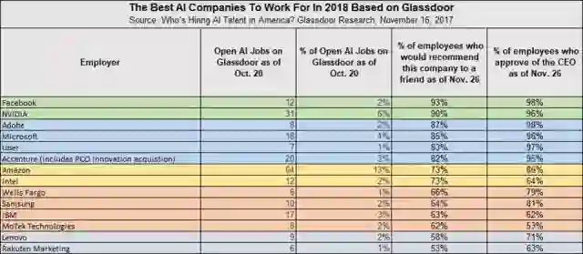 Facebook、NVIDIA、Adobe、微软、Uber 和埃森哲是 2018 年最佳的五家人工智能公司。在 Glassdoor 网站上,这五家公司就已经公布了 96 个新的 AI 职位,占到网站总发布职位的 18.7%。