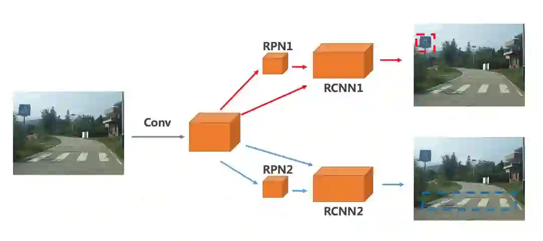 效果方面:将检测目标根据外形特征分为N大类(如圆形、三角形、方形,以及高宽比异常的人行横道等),再为每一类配置专属的RPN网络,各个RPN根据对应的尺寸特性设计Anchor的Ratio和Scale;不同RPN根据需要使用不同层的特征图,设计更有针对性;