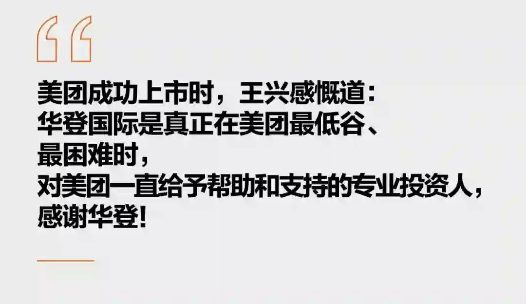 移动互联网兴起之时,华登国际关注团购,经过调研,决定投资在头部的美团。美团CEO王兴对创业的执著坚持,吸引了华登国际。2018年9月20日,美团成功上市时,王兴感慨道:华登国际是真正在美团最低谷、最困难时,对美团一直给予帮助和支持的专业投资人,感谢华登!