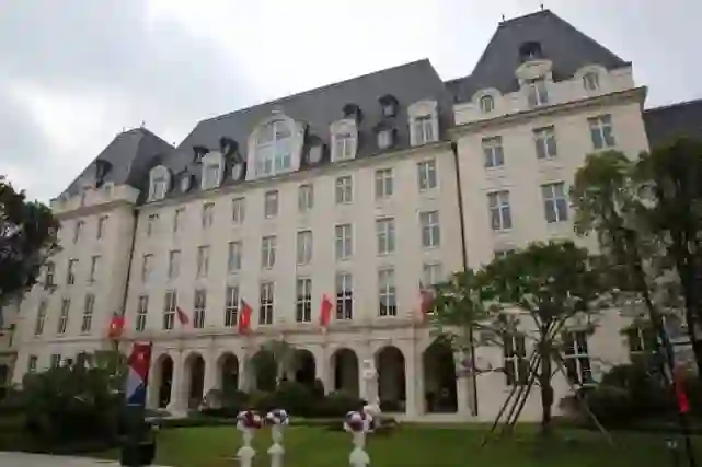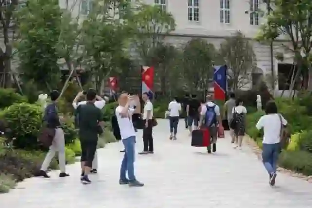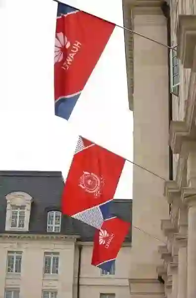 道路两旁装饰着法国国旗色为主色调的道旗,仔细看看,旗上还镶嵌着华为logo和徽章,据说是设计师为巴黎组团设计的。一个同事脱口而出:怎么感觉像国际学校的入学仪式?喂,所以你是觉得到了霍格沃茨?