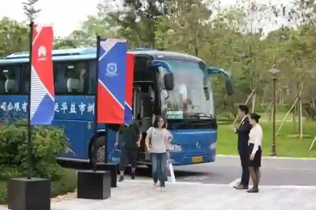 紧接着,一辆又一辆东莞、深圳出发的班车陆续到达。帅气的管家小哥哥和美丽的管家小姐姐站在车门边迎接。