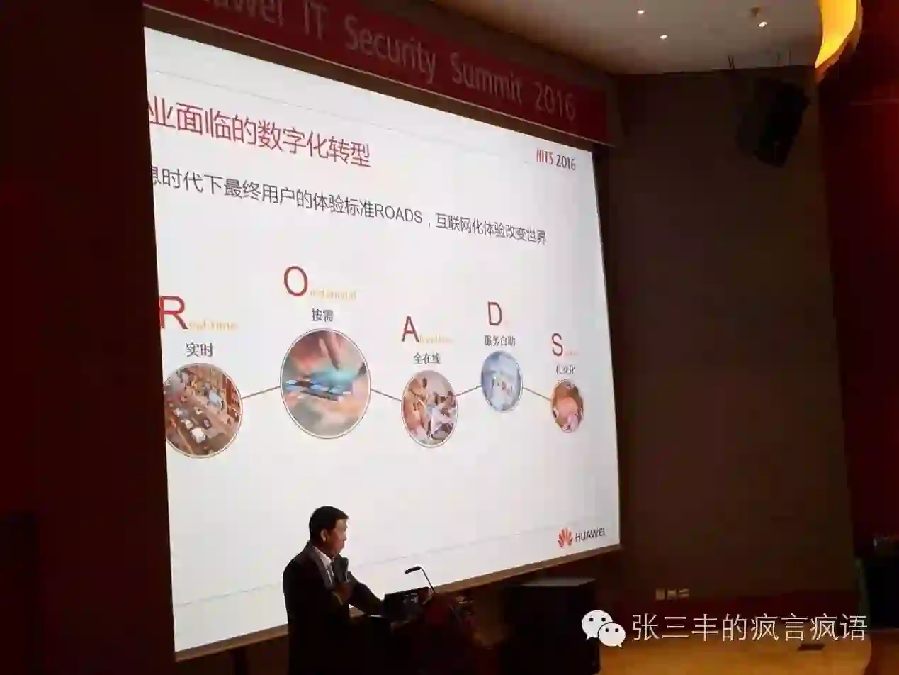 而华为质量与流程IT的总裁也在keynote中提到数字化时代的IT的变革要率先实现ROADS(实时、按需、全在线、服务自助和社交化)的目标,这几点跟Gartner的观点都是一致的。改善传统的销售模式,最终使客户能够去体验、感知、认知到产品,然后再把产品转变成销售。