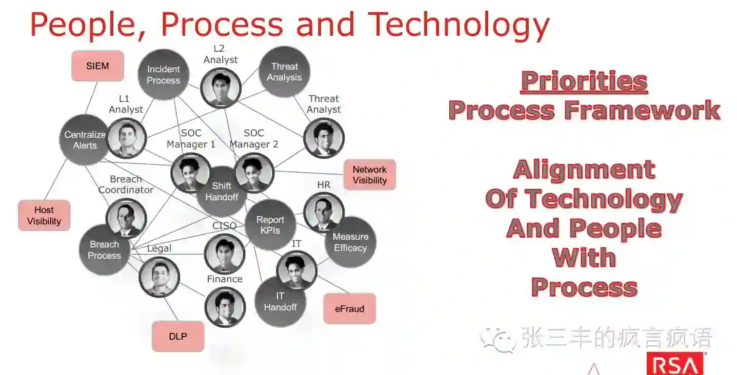 安全是个对抗的过程,除了强大的安全防御能力外,对抗过程持续的运营也很重要。峰会里面另一个重要话题就是有关安全运营和攻防技术的,比如如何构建下一代的安全运营中心的议题就谈到SIEM其实只是工具,要构建一流的SOC,需要充分考虑技术technology、流程Process和人People。除了SIEM、DLP、网络可视化、主机可视化等工具的辅助,还需要事件流程、数据泄露流程、交接班流程等等,最关键的还是需要安全分析师。