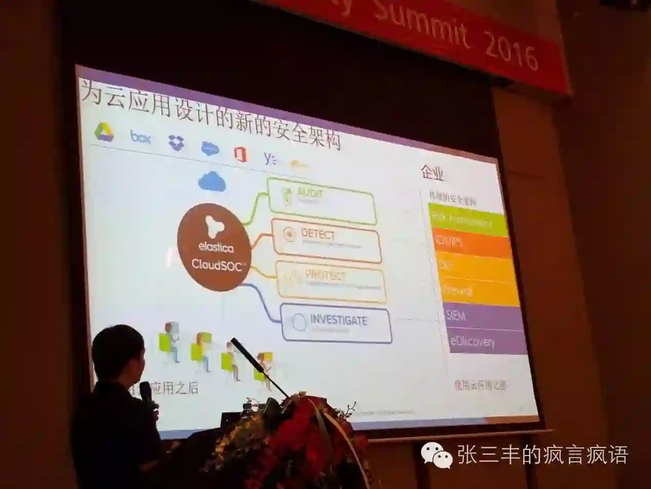两天的峰会,涉及最多的议题莫过于云访问安全代理(Cloud Access Security Brokers,CASB)的方案。IntelSecurity的,skyhigh的,Symantec的,bluecoat的还有Imperva和Zscaler的云安全网关方案。随着IT应用的云化(例如企业越来越多的使用像Google office,office365,Dropbox等云应用)相当于能够接触企业数据的接口越来越多,从传统的以DataCenter为中心的防护模式已经无法适应云化场景。也因此出现了CASB,不管是shadow IT,shadow Data还是帐号盗用,恶意的数据访问等,都通过CASB来进行审计、监测、保护和调查。当然从不同的考量维度,各家的方案还有个优劣,比如支持的云应用是否足够多?提供的安全管理功能是否够强大?是否支持SSL解密等等。