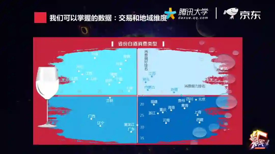 谈到地域维度,嘉宾刘晖同样举了一个大家非常感兴趣的例子:哪些地方的人天生就是能喝或者爱喝酒,所以京东每年都会给出一个红白黄啤四种酒类在全国的消费分布。