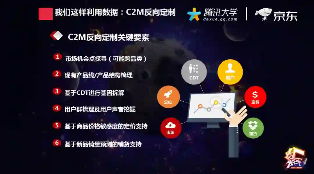 C2M反向定制,也是京东基于大数据的一项重要举措。嘉宾刘晖为我们简单梳理了一下C2M反向定制的一些关键要素。