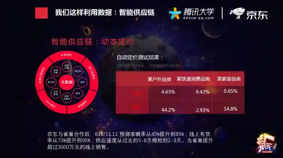 例如,京东可以告诉上游企业,它的某一款商品在未来一个季度究竟在全国的500多个仓库,每个仓库放多少个产品合适。京东也可以告诉一个企业,要对这款春季的时尚服装进行清仓了,该如何确定价格曲线,什么时候该降价多少钱?
